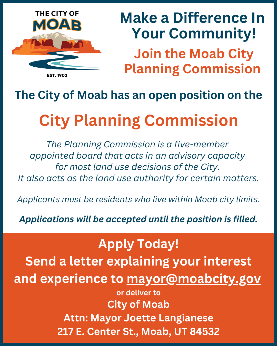 To apply for a position on the Moab City Planning Commission send a letter of application to: mayor@moabcity.gov or deliver the application letter to: City of Moab, Attn: Mayor Joette Langianese, 217 E. Center St., Moab, UT 84532. Letters of application should explain the applicant’s interest in serving on the planning commission and any relevant experience. Application letters must include name, mailing address, city, zip code, daytime phone number, and email address.